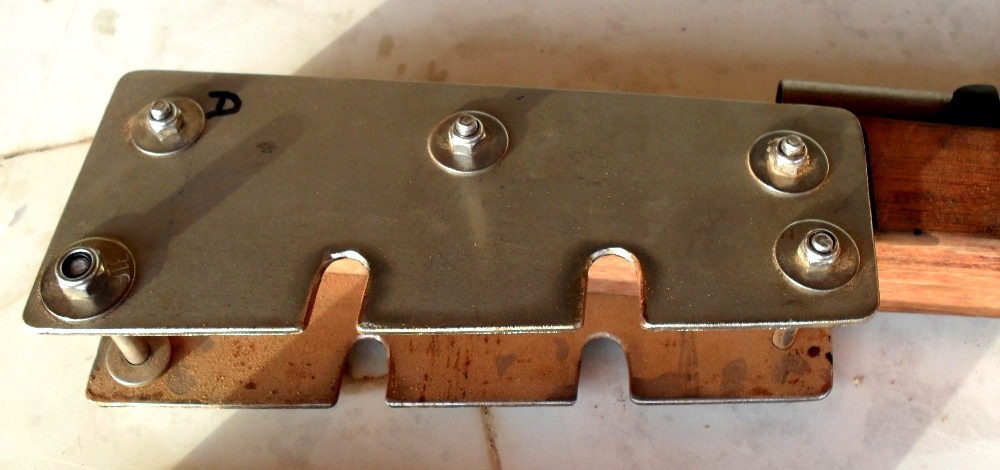 Cette barre est prise en sandwich entre deux plaques d'inox de 30 cm de long et d'épaisseur 4 mm. Ces plaques trapézoïdales ont une hauteur de 13 cm derrière et 10 cm devant , elles sont maintenues sur la barre par 3 boulons inox de 10 mm.