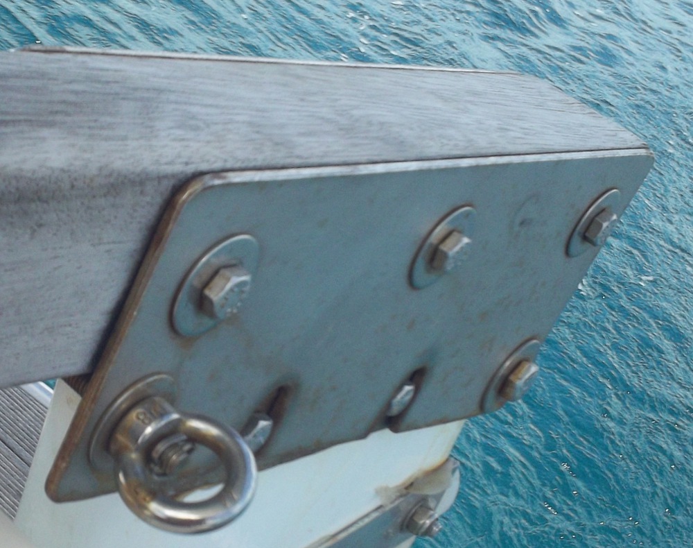 La ferrure du pilote a été réalisée avec un plat d'inox de 40 de large d'épaisseur 3 mm cintré en U et "mal" soudé sur deux U boulonnés à travers la barre par des boulons de 6 mm.