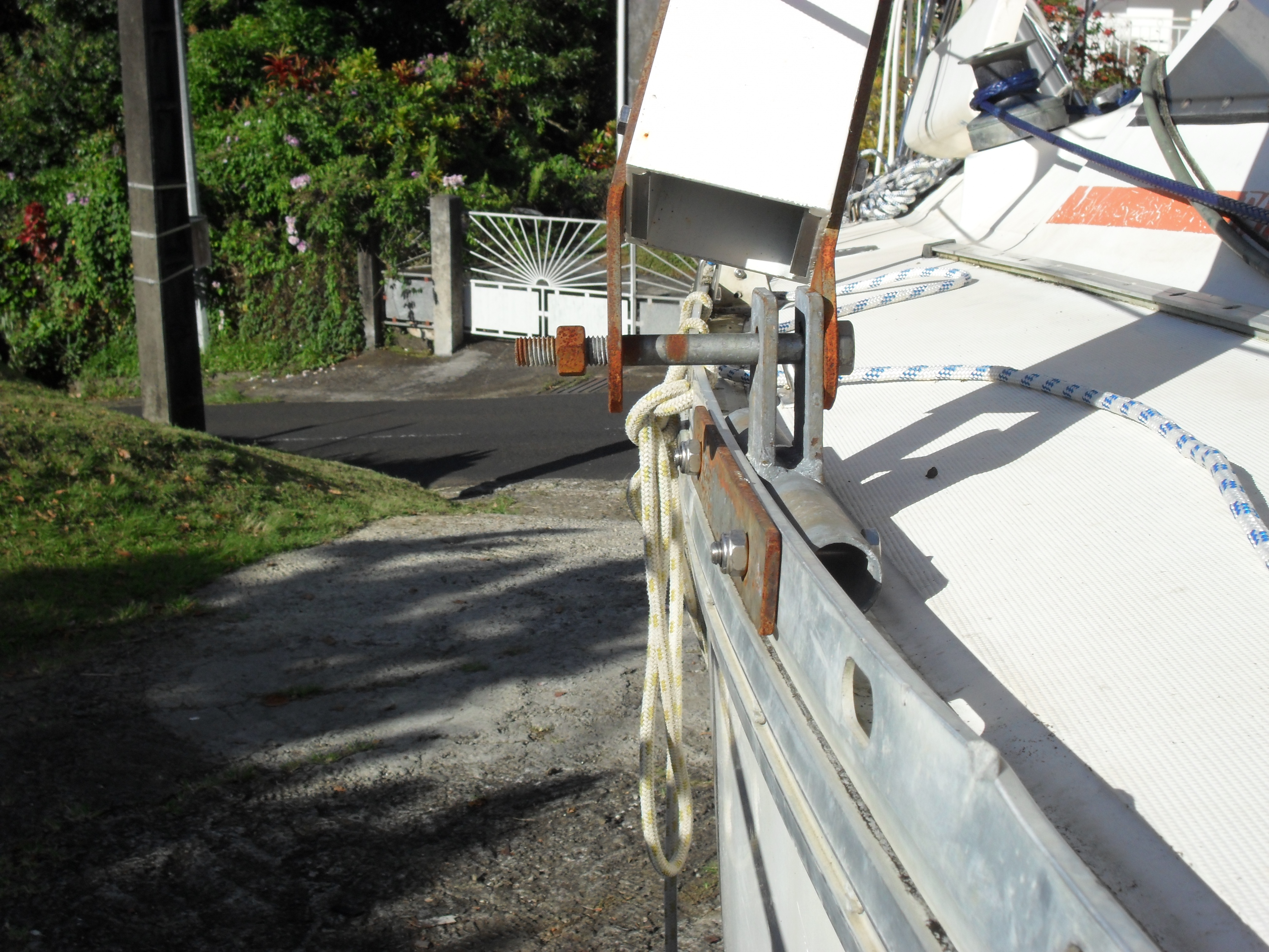 Les traverses sont également munies d'arc-boutants pour la rigidité ainsi que de maillons de chaine de 14 mm soudés permettant l'accrochage par un trans-filage au rail de fargue du bateau en prévision de la saison cyclonique.