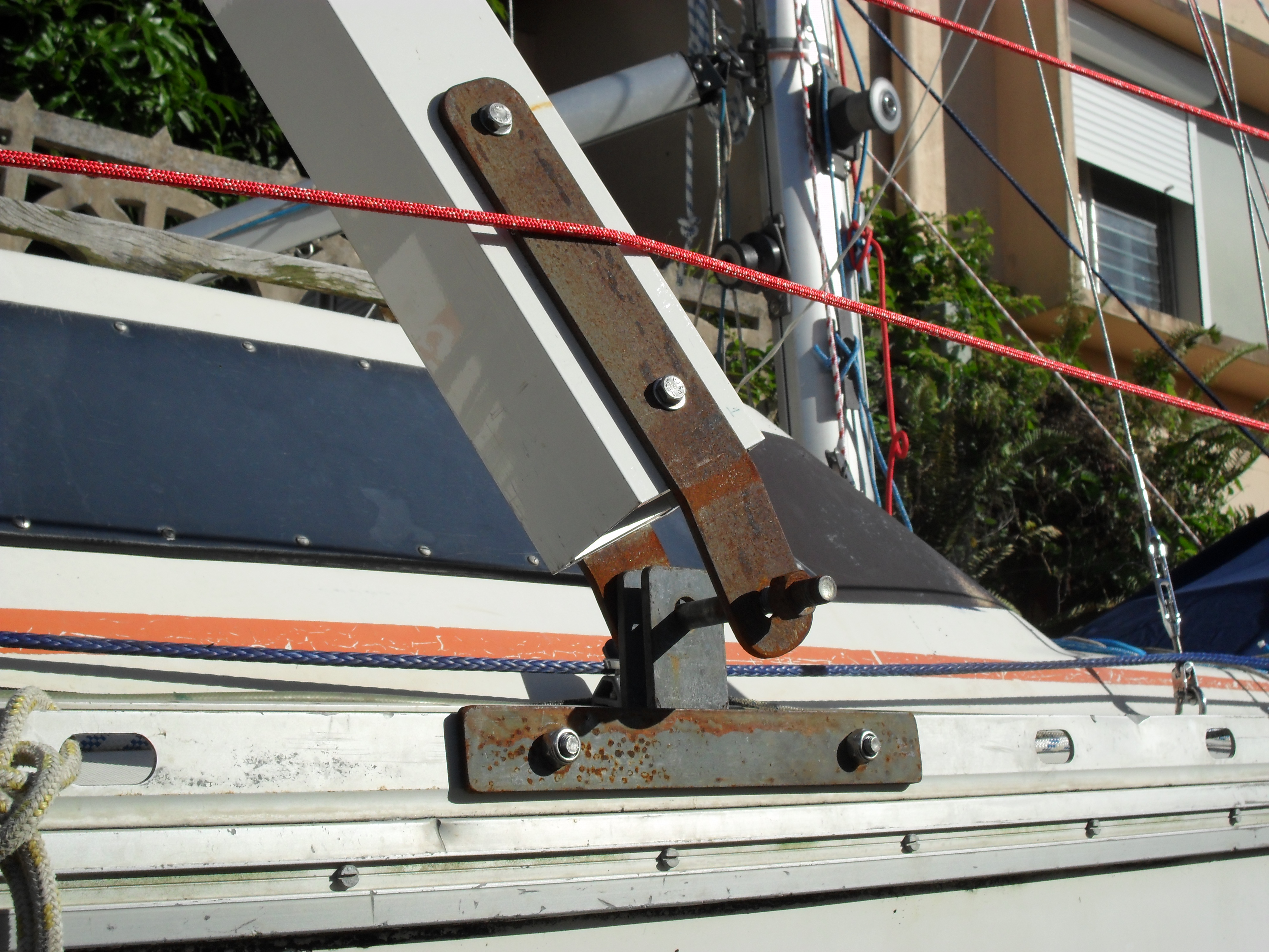 Cette chèvre est constituée de tubes aluminium carrés de section xxx et d'épaisseur xxx. En bas une ferrure avec articulation répartit la charge sur le rail de fargue avec une contre plaque. En haut , une ferrure réunit les deux tubes et permet de fixer la poulie du palan qui maintient la boucle coulissant sous les barres de flèches qui permet l'abattage ou le dressage du mat.