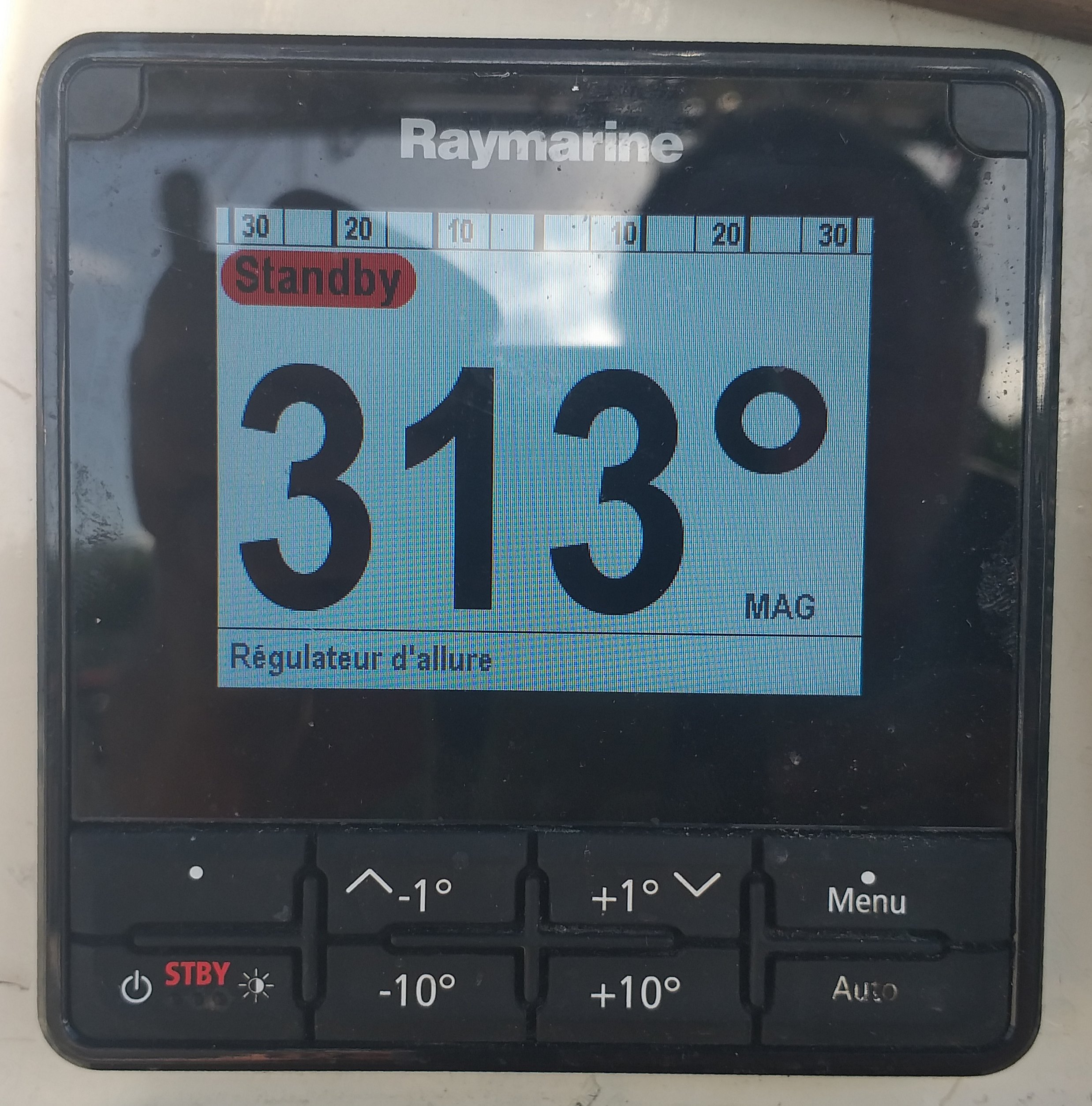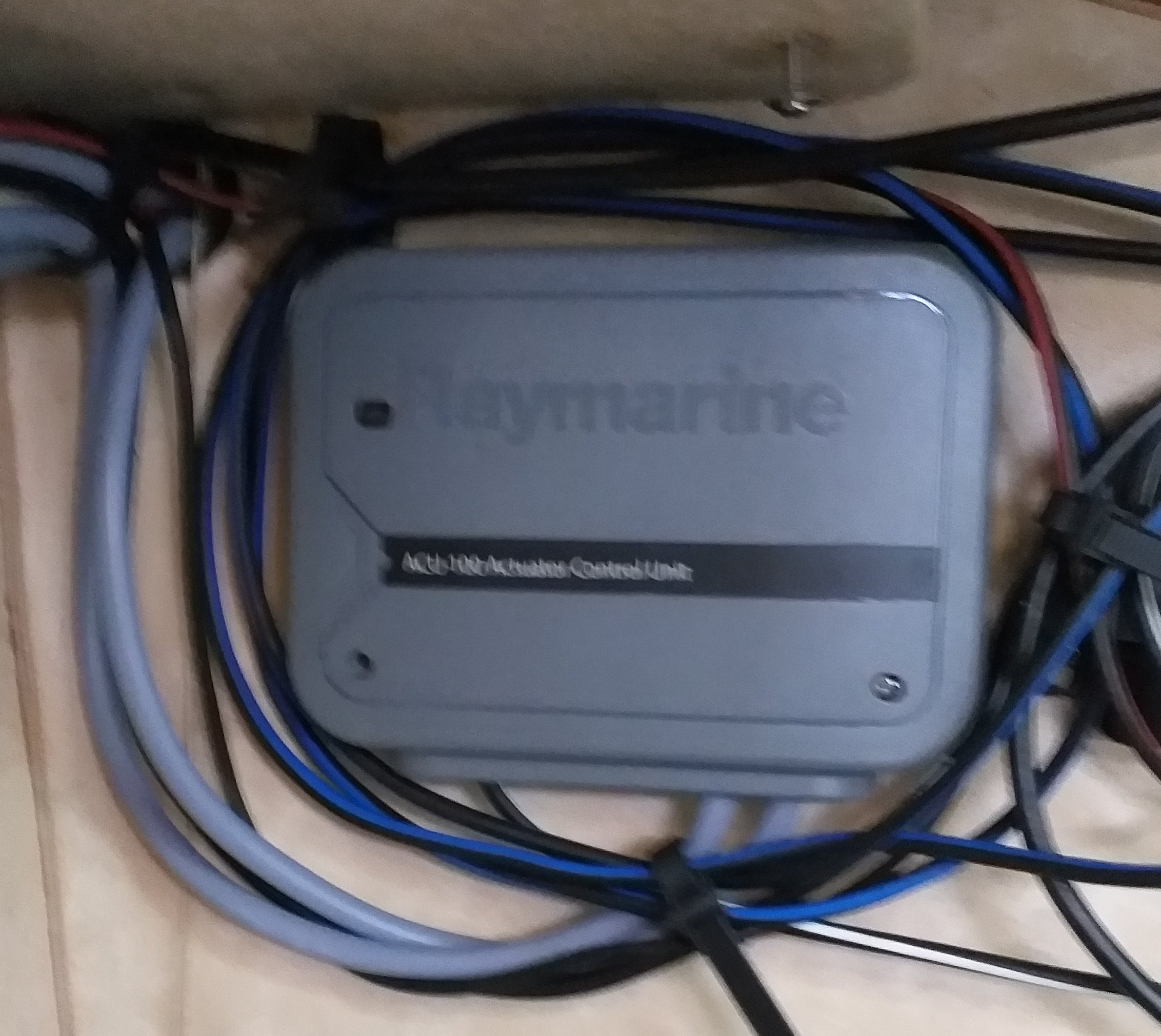 Je voulais asservir le pilote à un capteur de direction de vent , j'ai donc installé une centrale RAYMARINE complète comprenant un compas electronique , une unité centrale , une alimentation de vérin de pilote , un vérin de pilote , une girouette , une sonde de profondeur , le boitier de conversion analogique -> digital , deux afficheurs et les nombreux fils et raccords nécessaires.