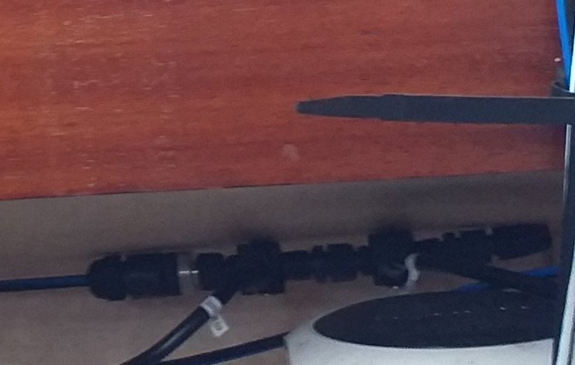 Le support replié obstrue la partie haute du compartiment WC (les WC ont été condamnés et transformés en espace de rangement) , par contre au mouillage il masque le cablage du bus dans le cabinet de toilette qui est passablement inesthétique , mais très accessible.