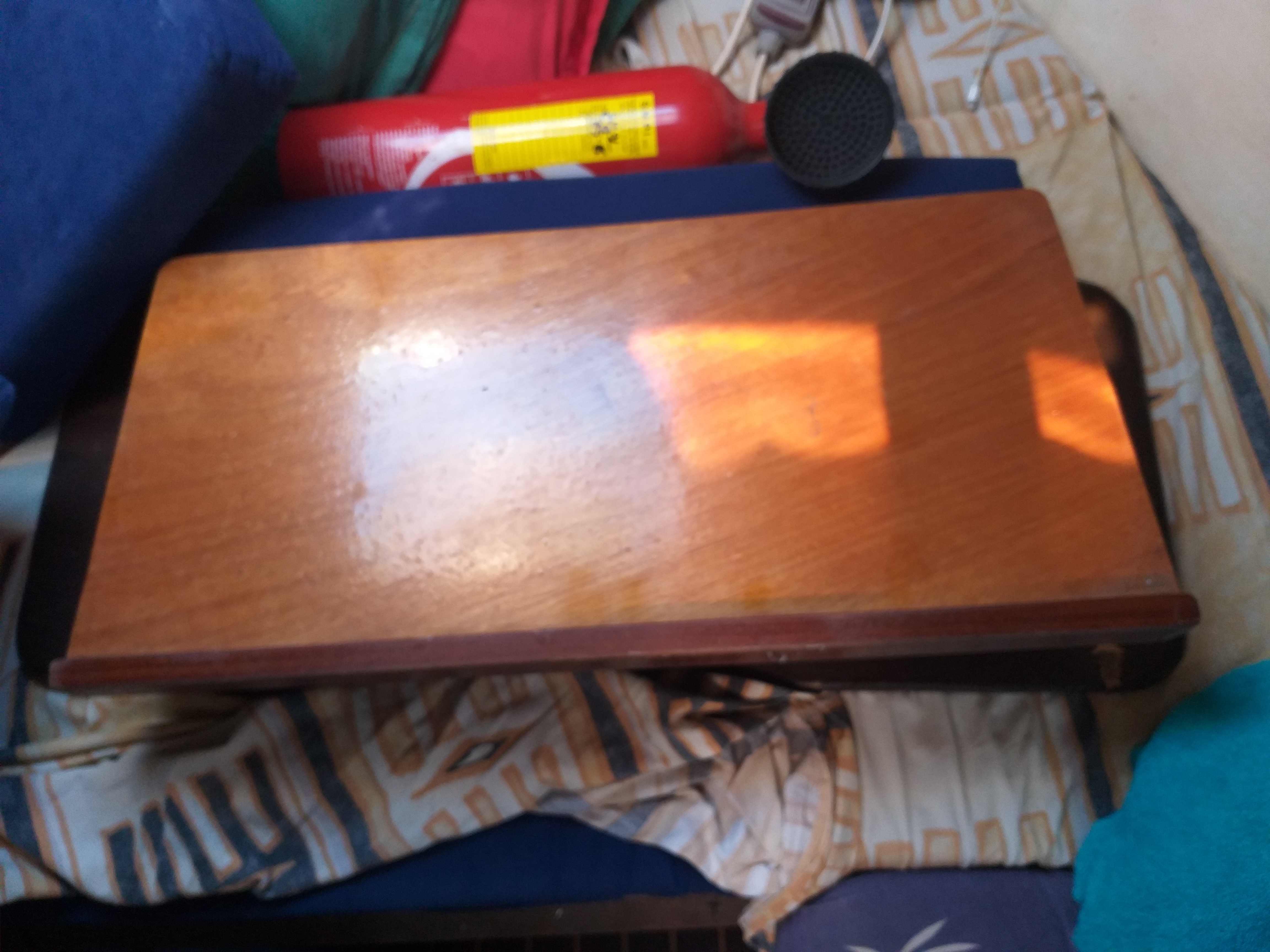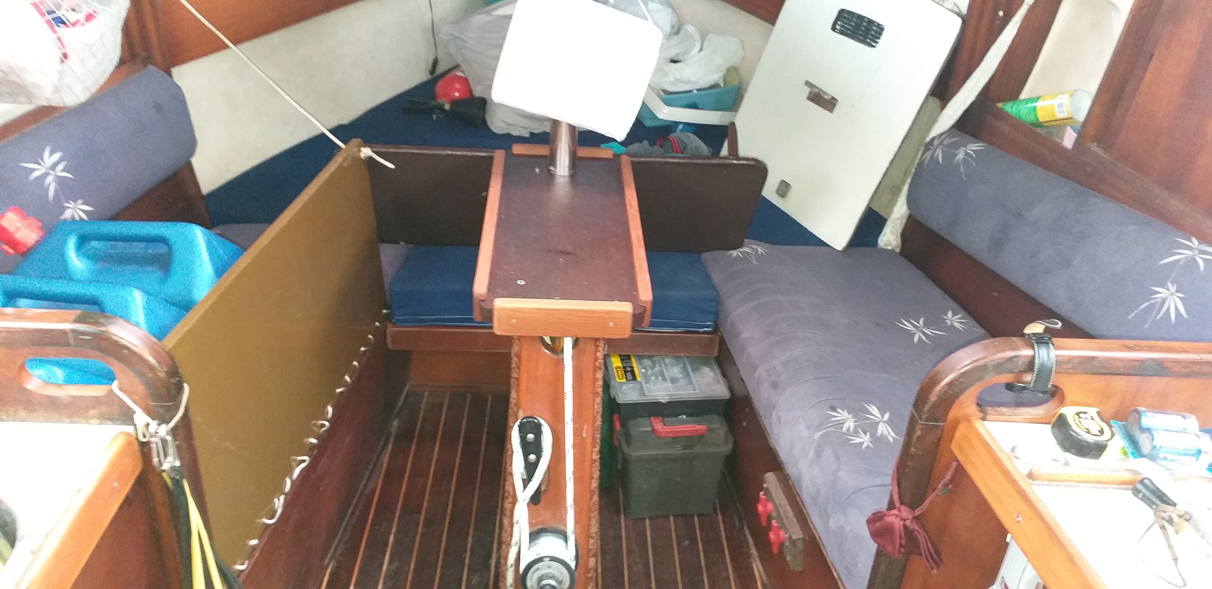 En position télé , un petit panneau de contreplaqué mesurant 90 cm de long par 34 cm de haut et d'une épaisseur de 19 mm forme un dossier rigide confortable appuyé à la table et sert de support aux oreillers. Ce panneau se range horizontalement sur le coté babord du puits de dérive (sur les jerrycans de réserve d'eau potable ou sur le narguilé).