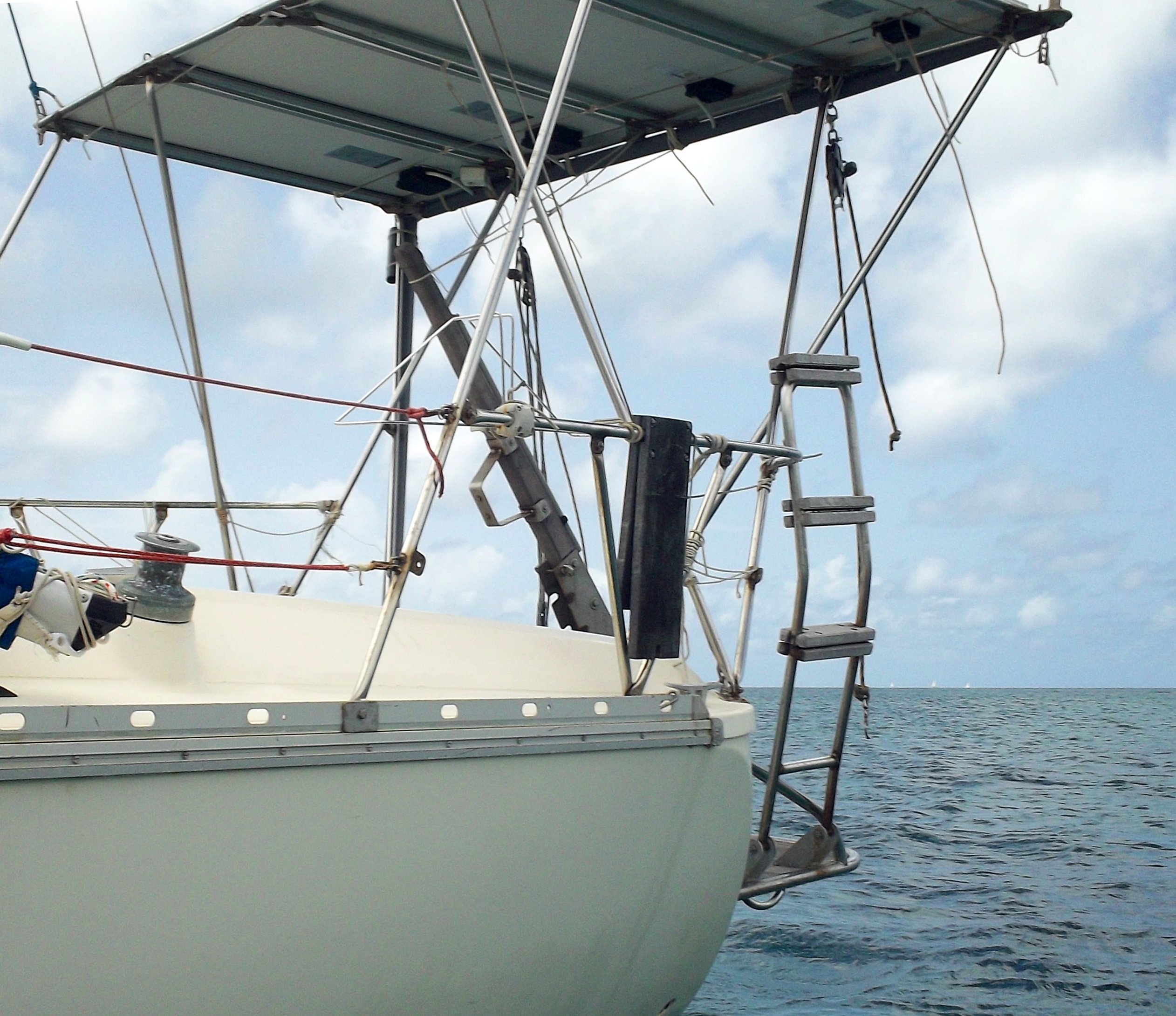 L'échelle est installée sur le coté babord de la plate forme ce qui permet d'utiliser comme poignée le renfort de plate forme et ensuite les tubes de fixation du portique de panneaux solaires.