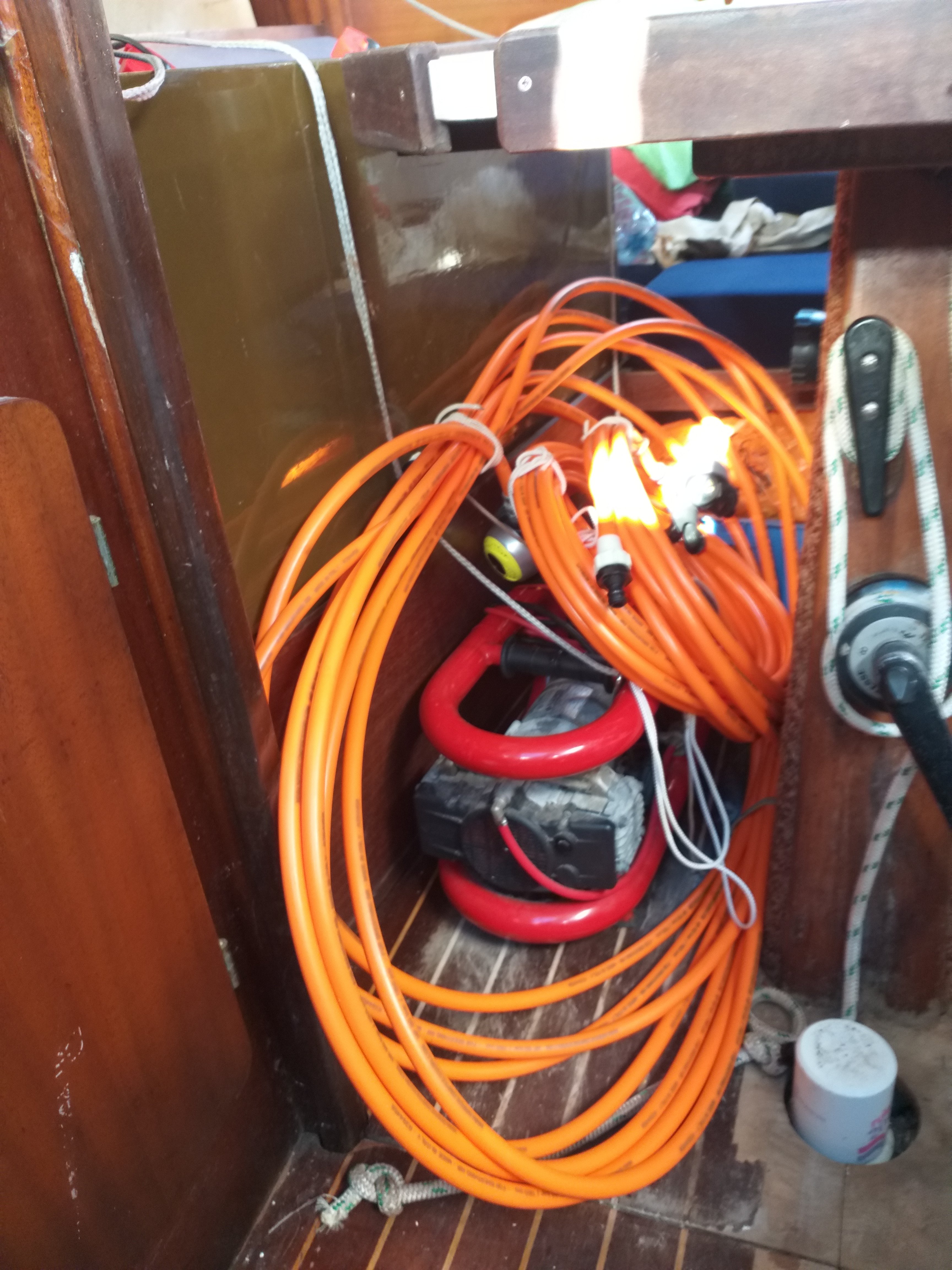 Compte tenu de l'intensité importante , deux prises femelles type poste à souder ont été cablées directement depuis les batteries de service. Le narguilé se branche directement sur ces prises à forte intensité.