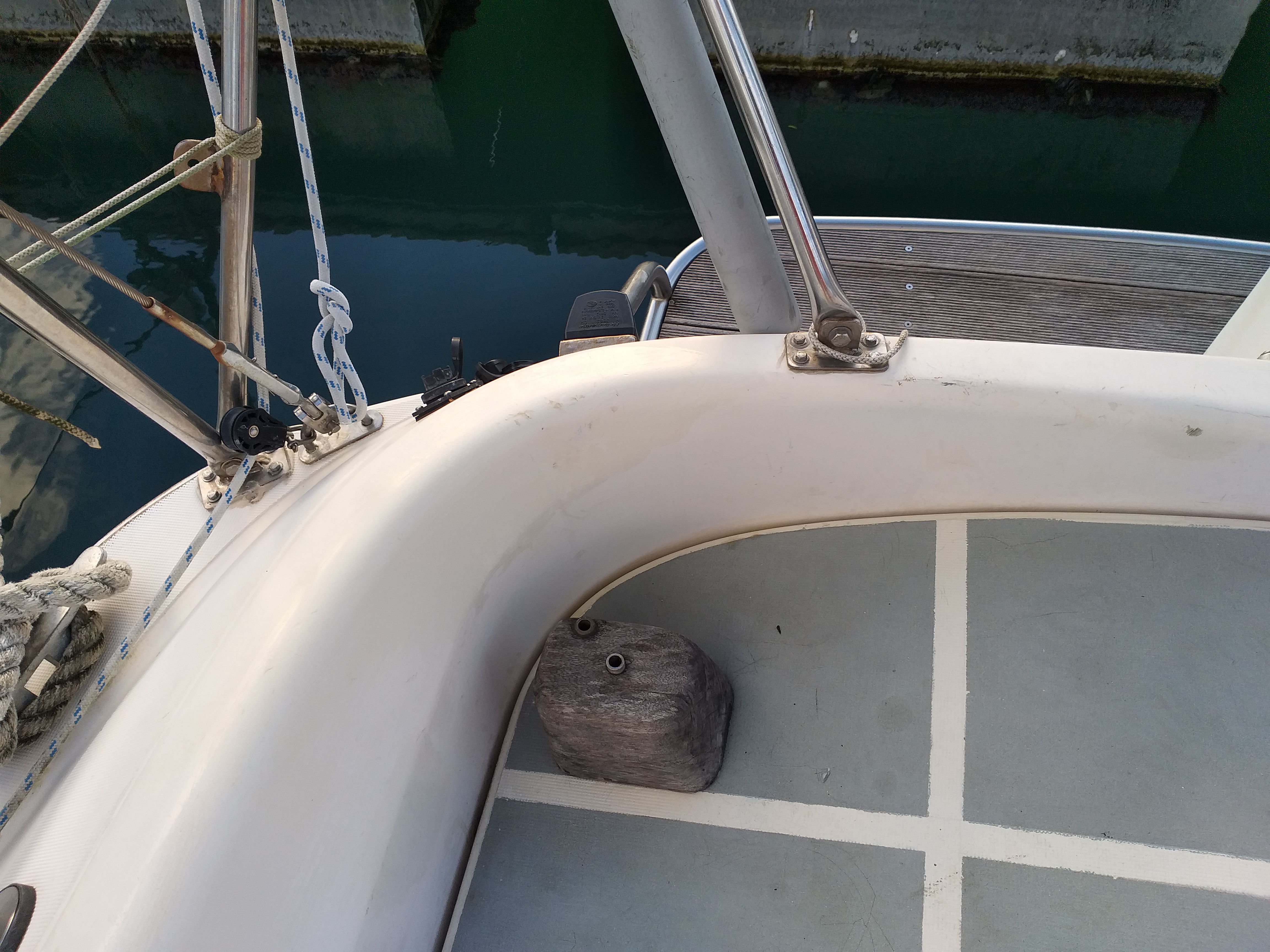 La fixation sur le couvercle du coffre arrière de cockpit entraîne un petit jeu préjudiciable quand la mer est un peu agitée et que personne n'est assis sur le couvercle : celui ci se déplace un peu en latéral au gré des mouvements du pilote. En navigation , je place des cales aux extrémités du couvercle.