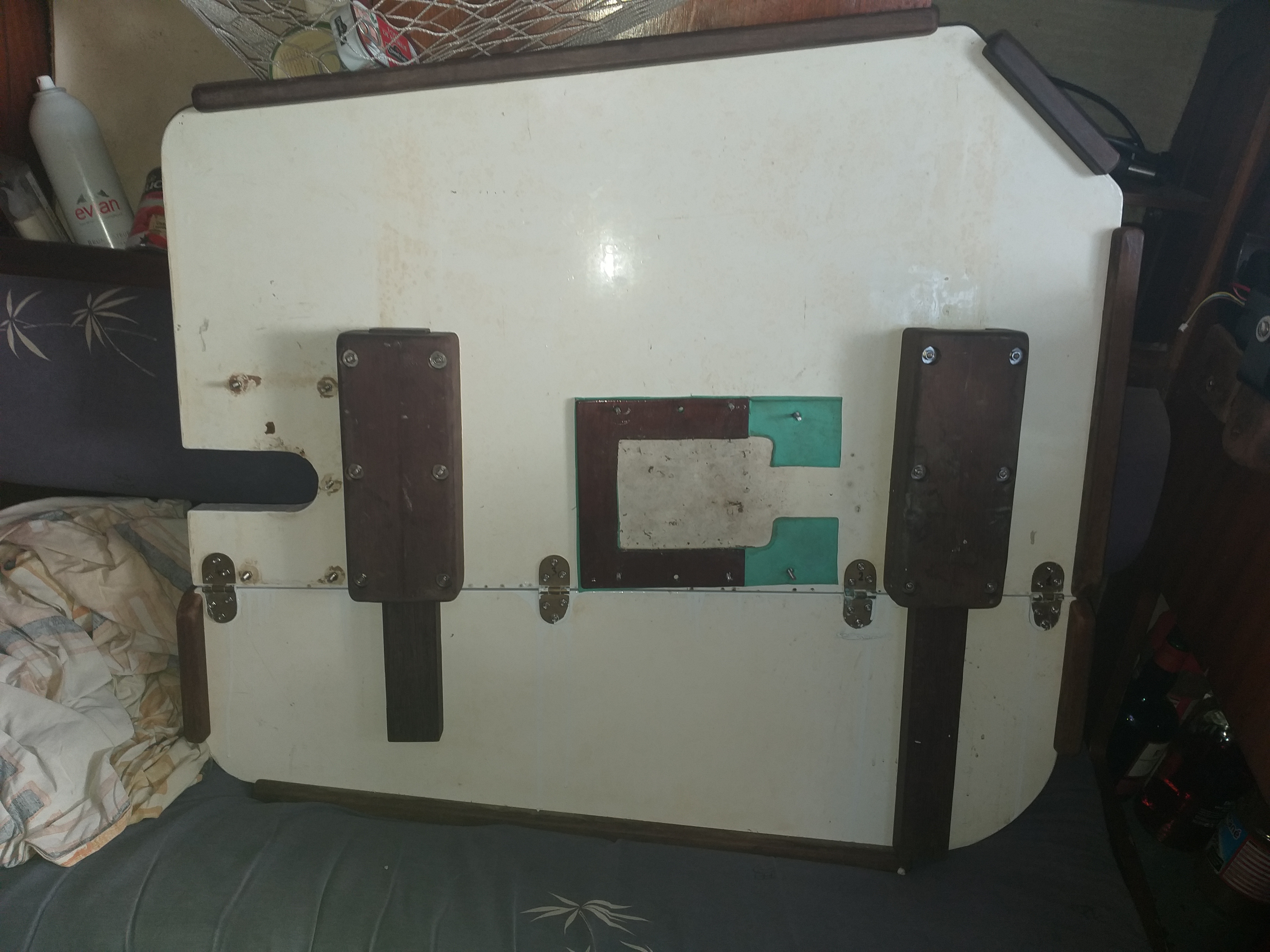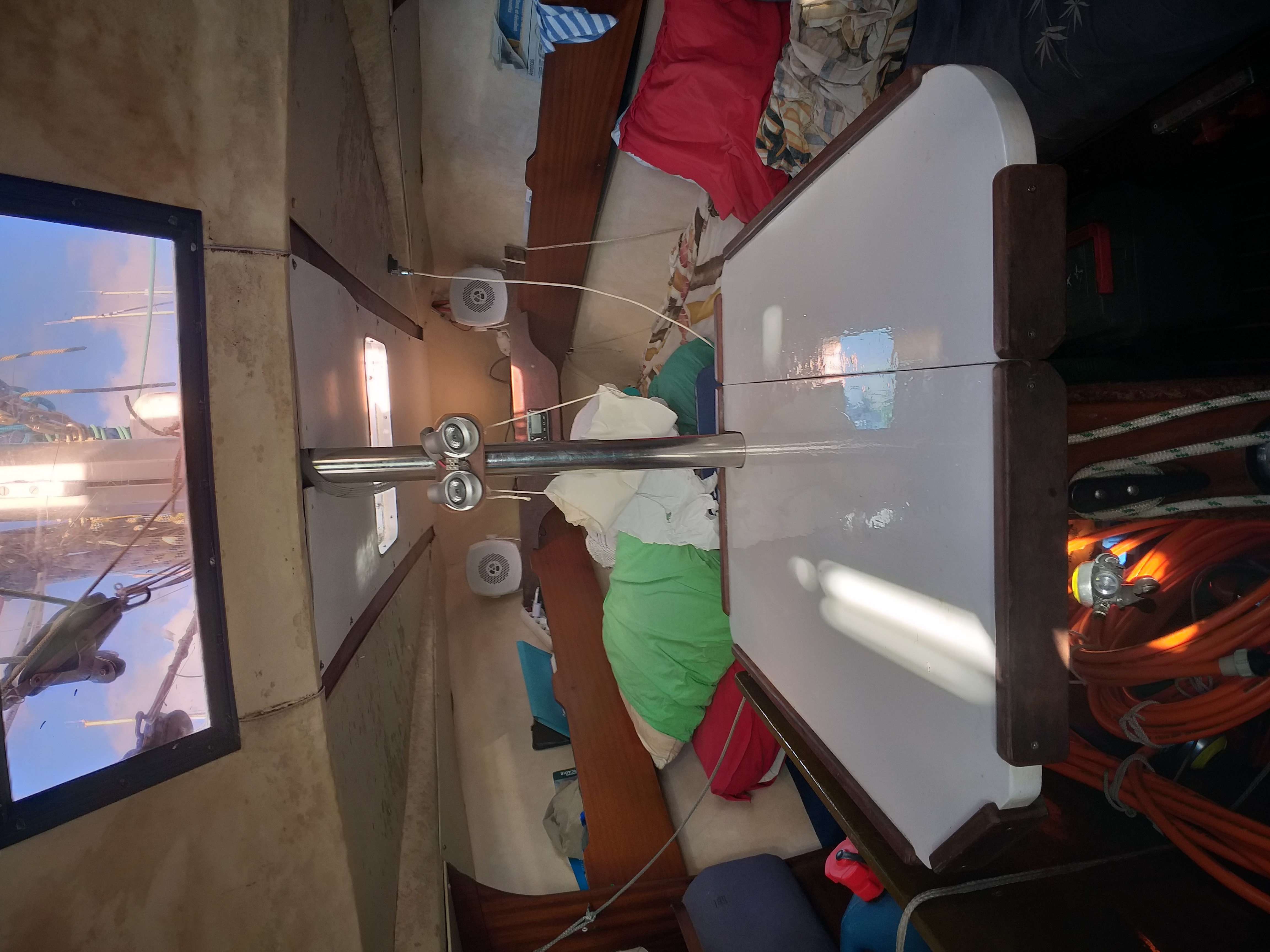 J'en ai profité pour monter un abattant sur le coté tribord de la table pour faciliter le passage vers la couchette avant. Le coté bâbord est fixe et la banquette bâbord est sacrifiée pour servir d'espace de rangement avec une planche antiroulis qui peut d'ailleurs être déplacée du coté tribord si on veut "matosser".