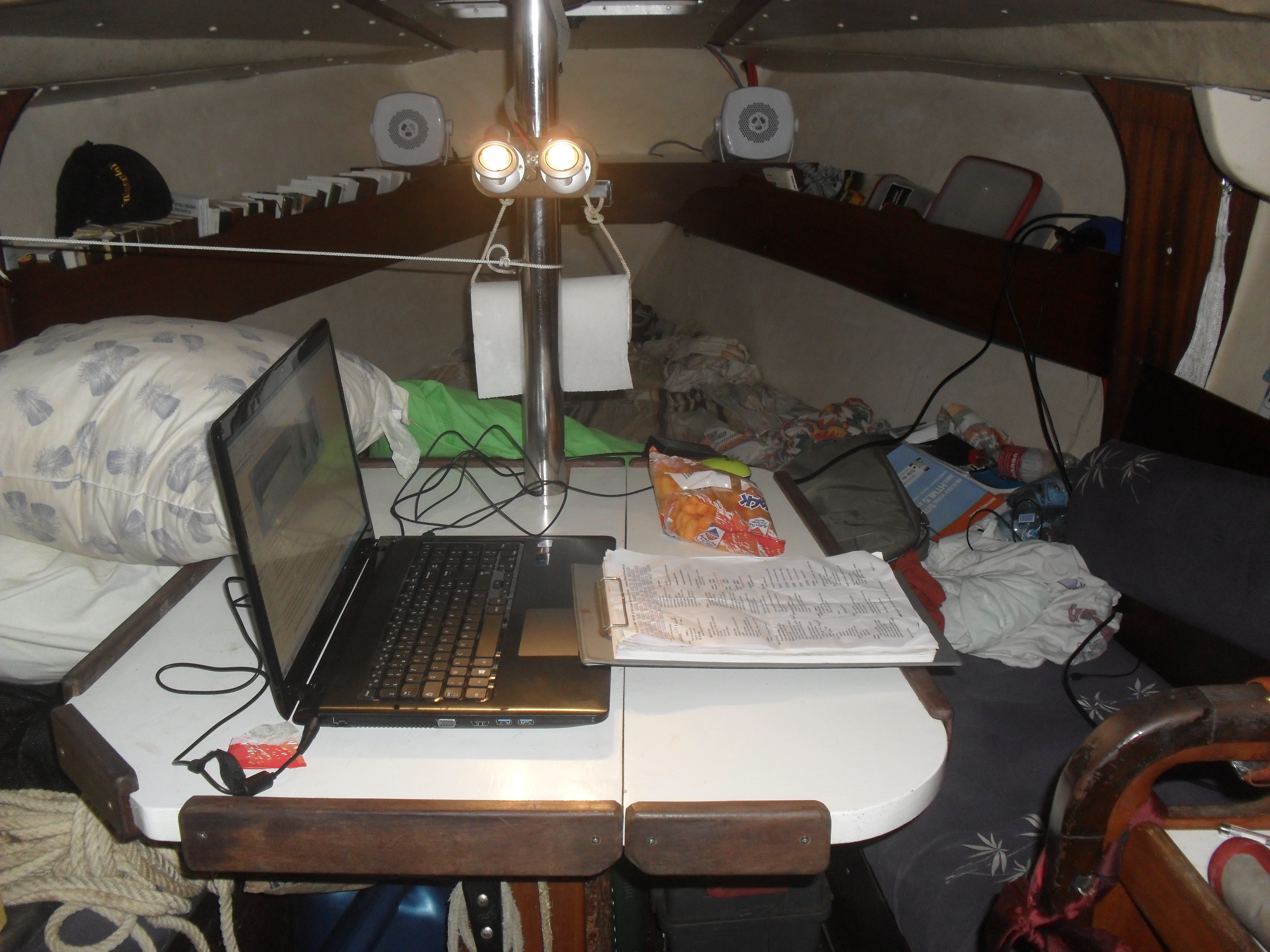 La table est bien pratique et rigide avec sa fixation sur le haut du puits de dérive et l'épontille de mat. Elle dispose de deux spots réglables et d'un distributeur de sopalin fixés à l'épontille de mat.