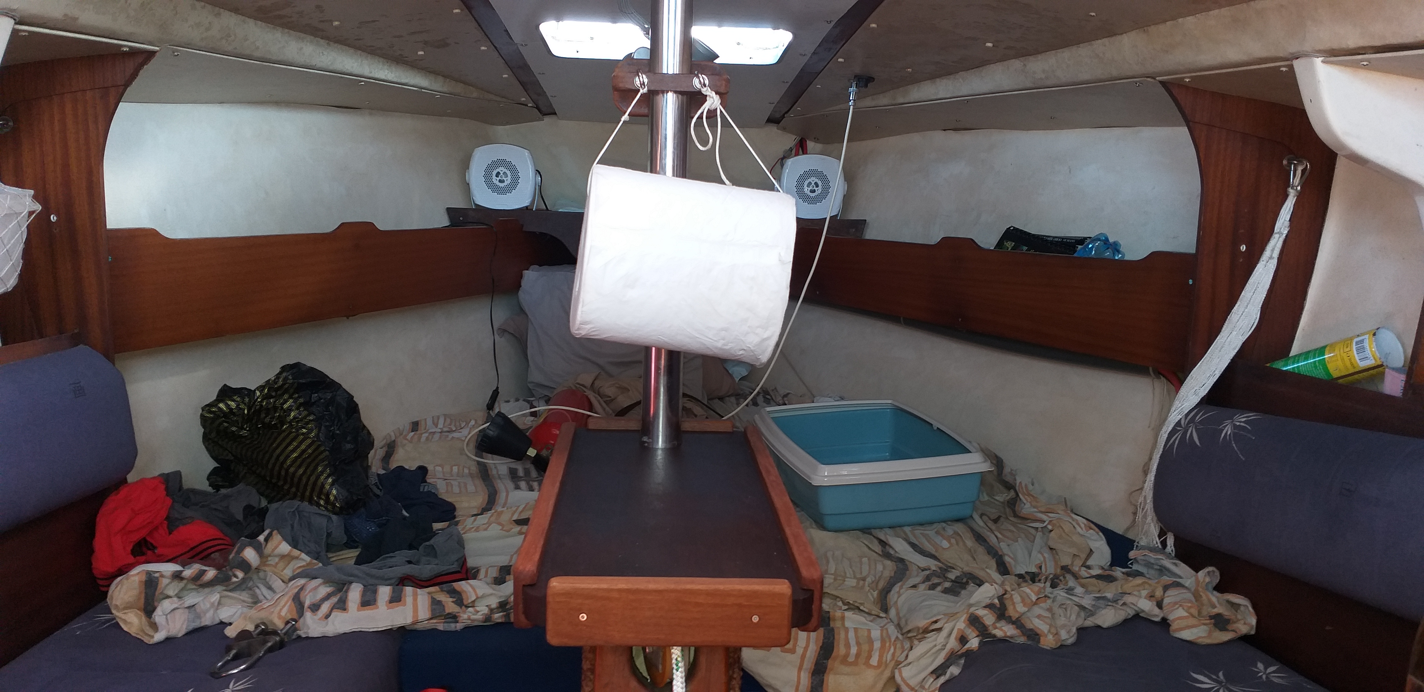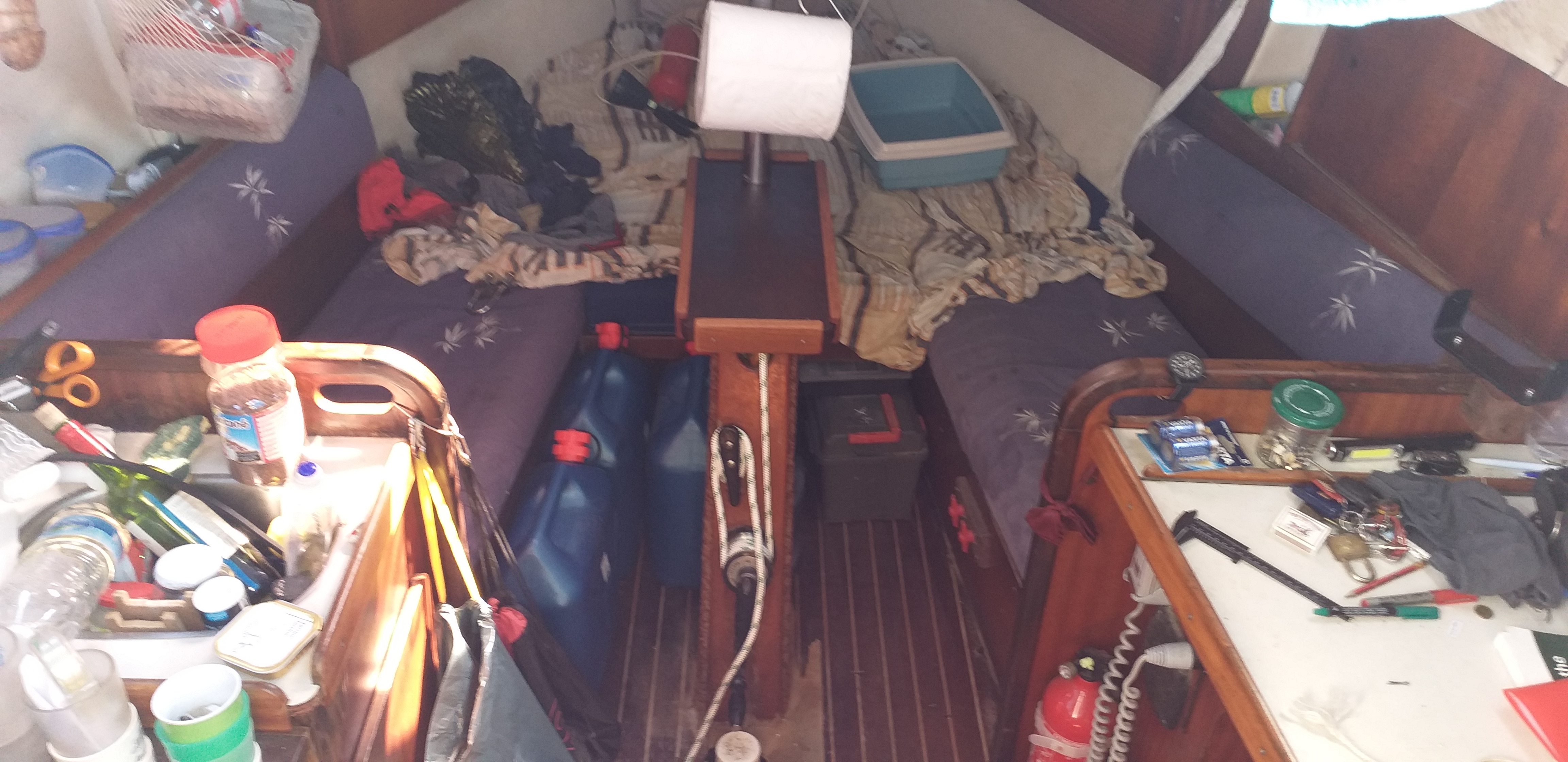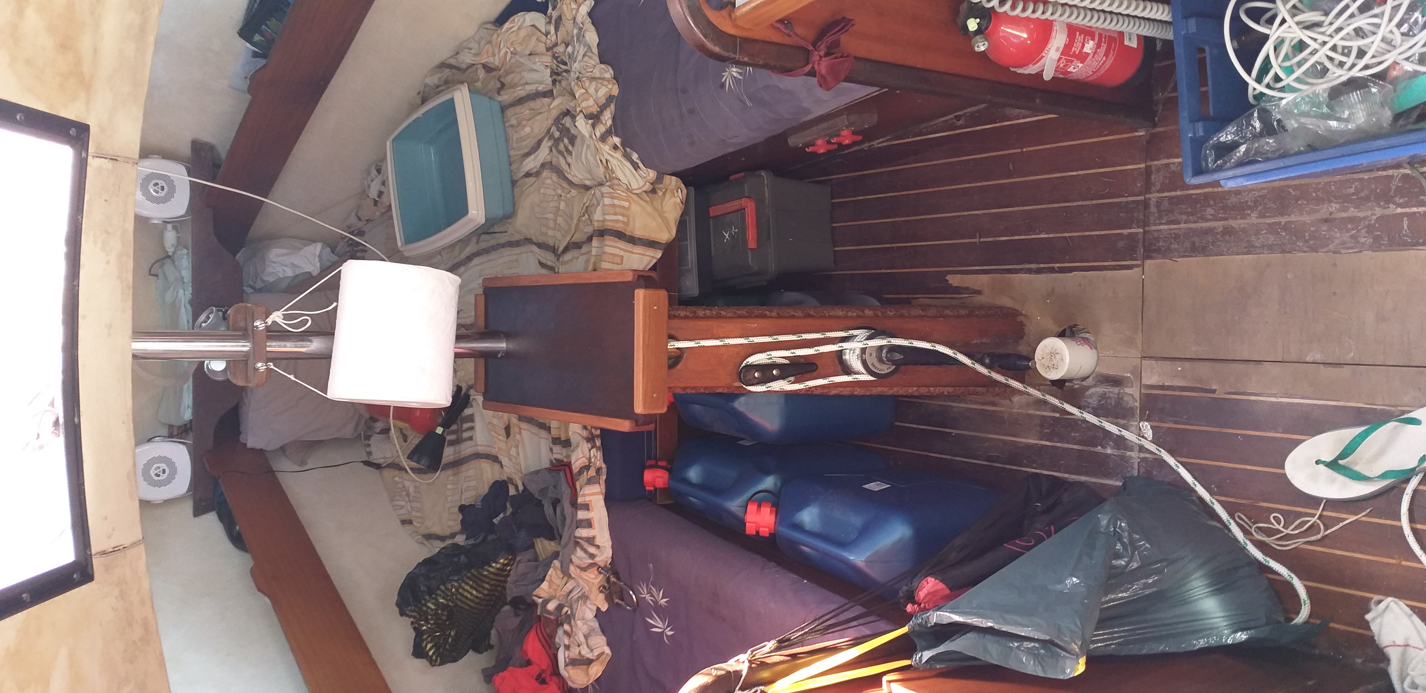 Quand la planche de "matossage" est à tribord avec ses jerrycans (retour des grenadines) , le passage vers l'avant est rendu un peu difficile avec un détour par la banquette car à bâbord il n'y a pas d'abattant repliable.