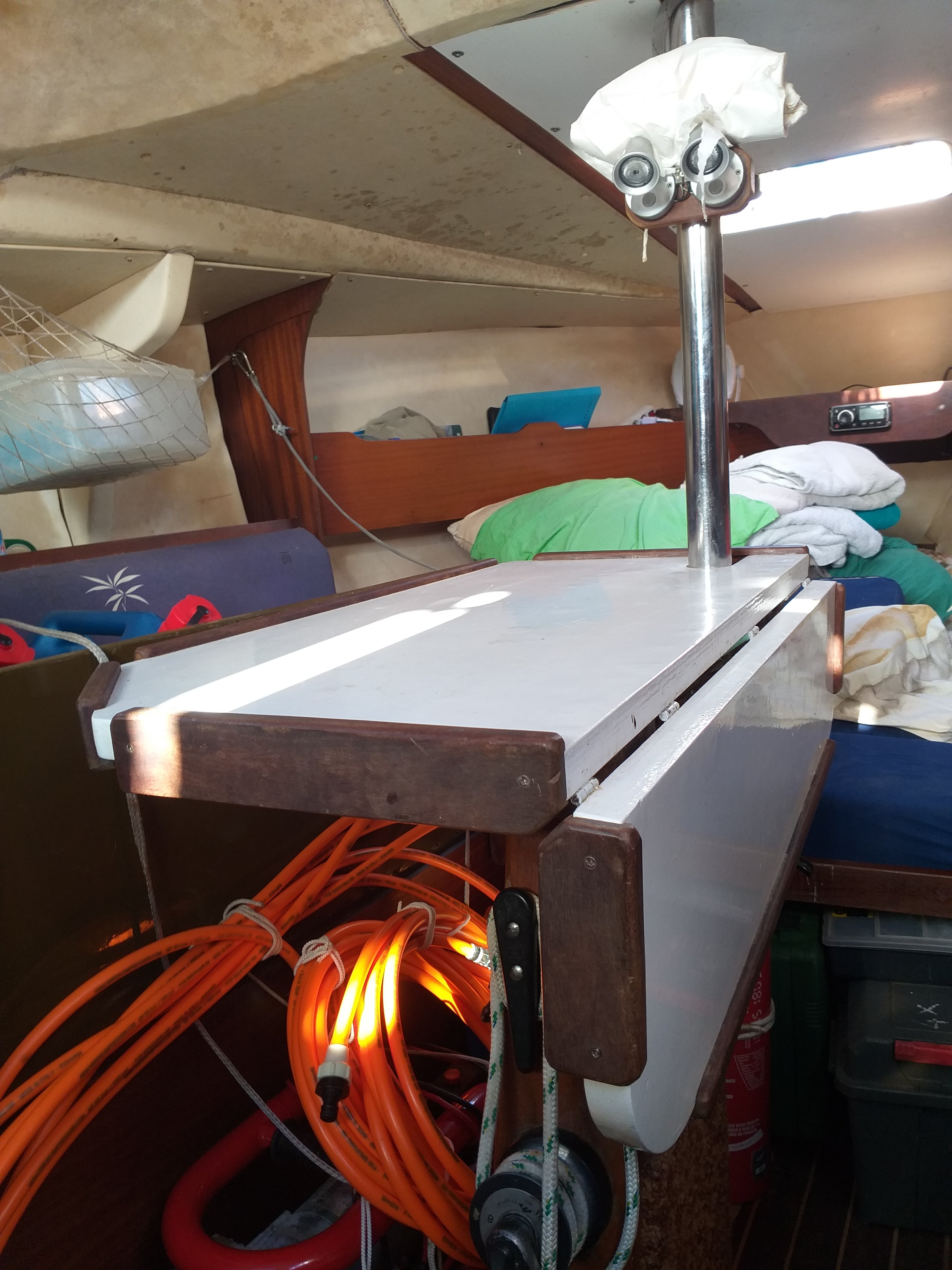 Une première version de table réduite au strict minimum pour faciliter le passage vers la couchette avant d'un coté ou de l'autre du puits de dérive avait été élaborée , mais elle n'a pas donné satisfaction car il faut pouvoir se replier pour manger à l'intérieur si le temps est vraiment à la pluie.