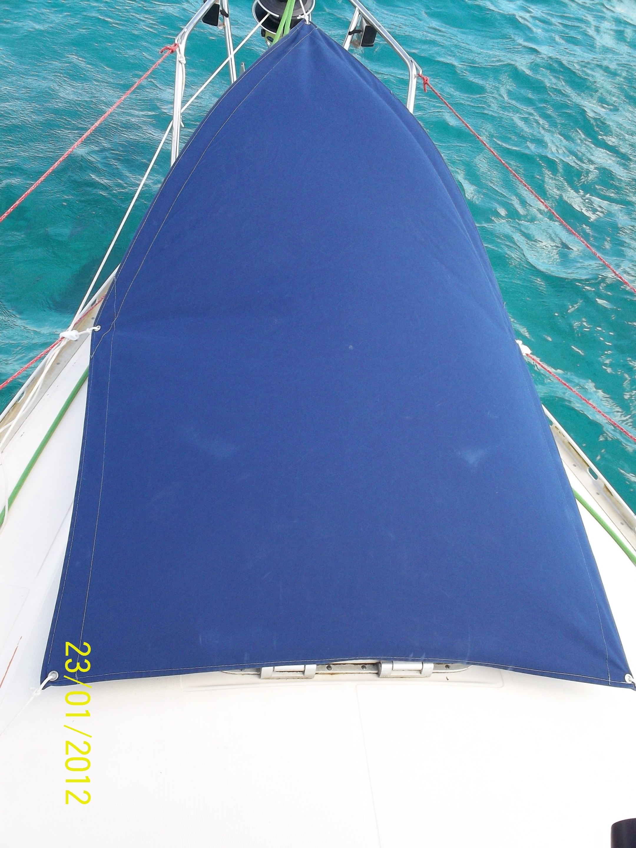 Le nouveau modèle est plus simple à établir et à rouler pour le rangement , l'accès à la baille à mouillage est plus facile et , si on passe les écoutes de génois au dessus , on peut même naviguer avec le taud roulé fixé dans le balcon avant.
