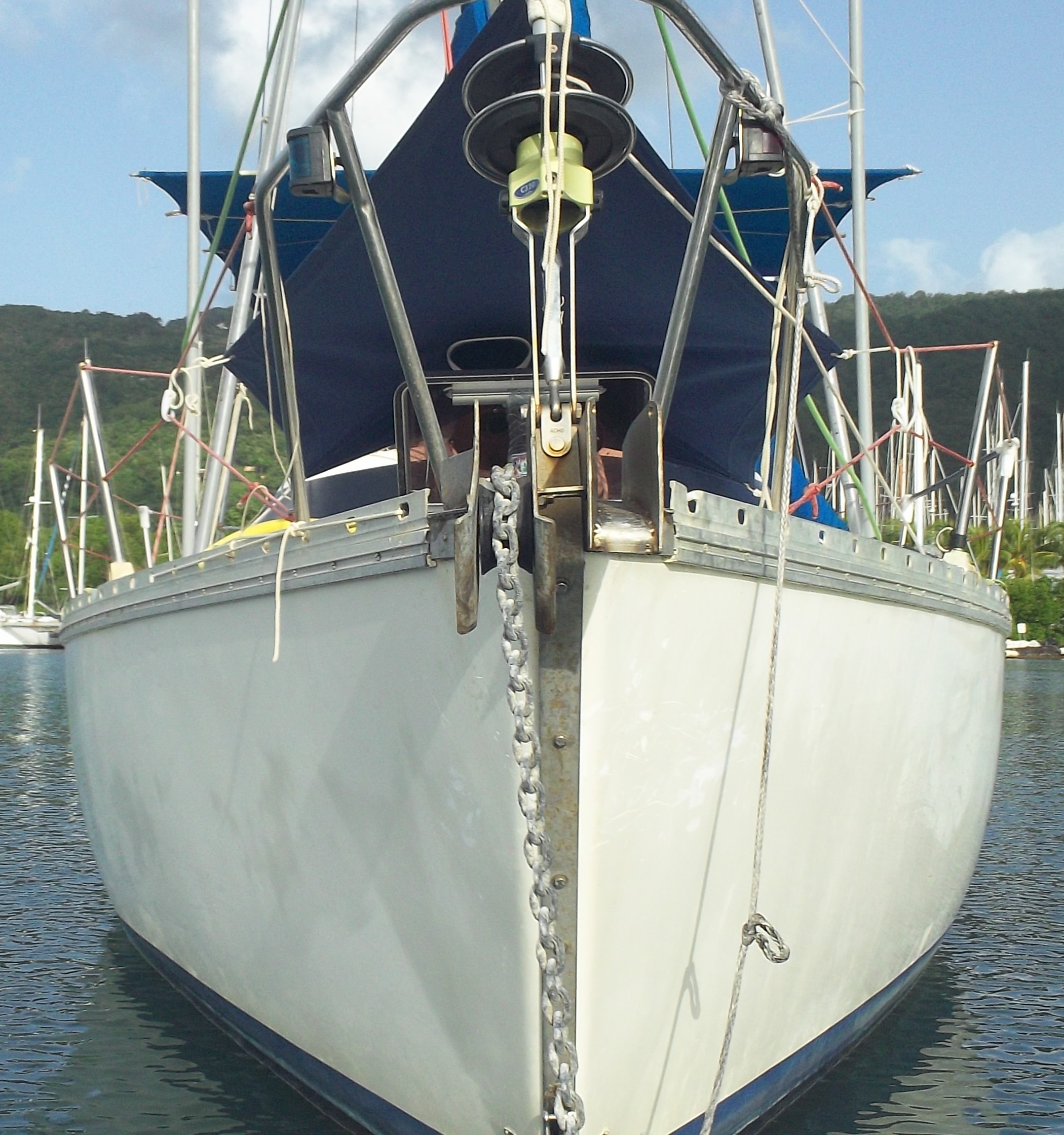 Ce taud gènait un peu la progression vers l'avant en cas de manoeuvre de mouillage urgente la nuit mais le seul bout à larguer dans ce cas étant celui qui était fixé sur l'étai , la pointe se rabattait toute seule vers l'arrière.