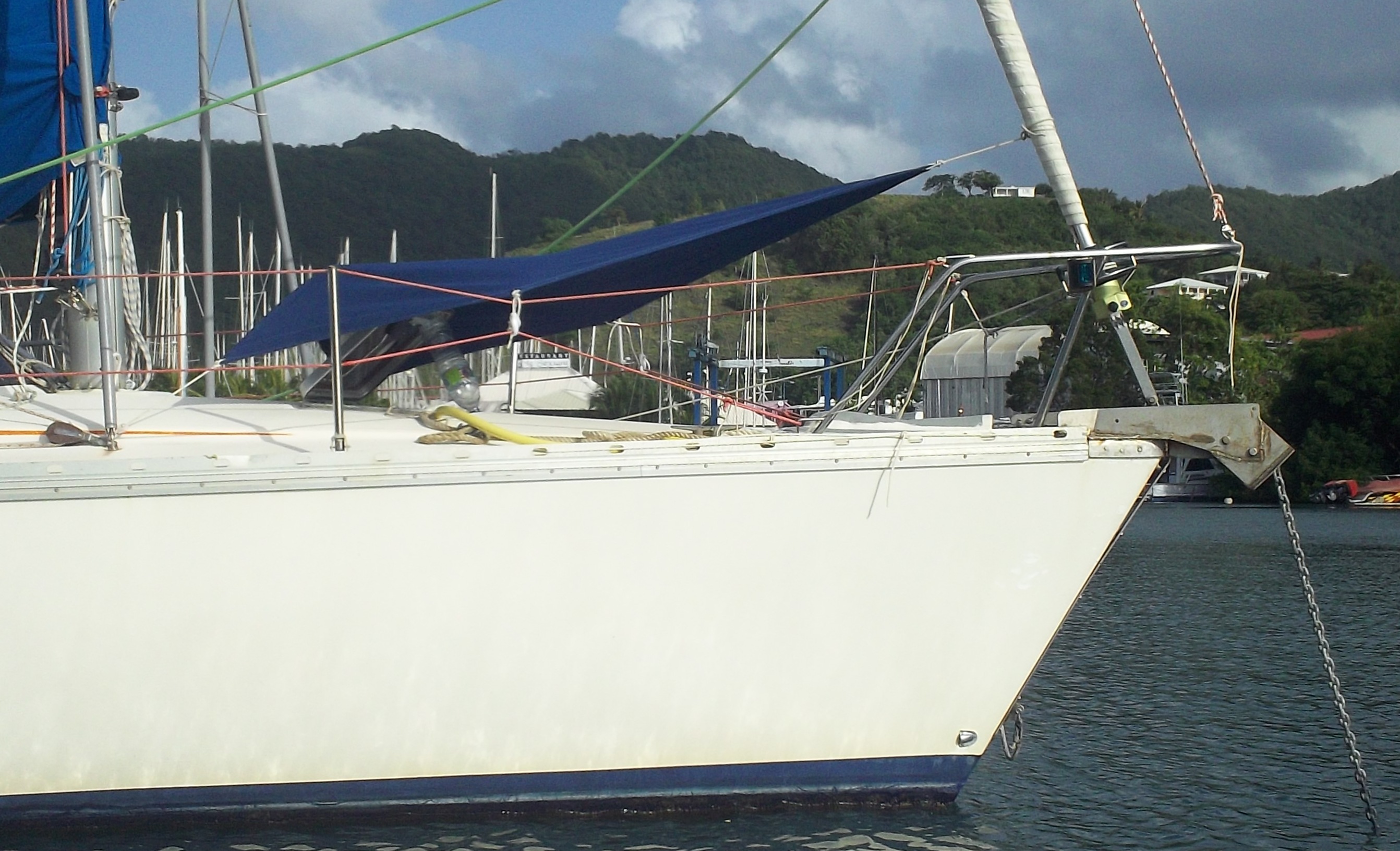 Un nouveau modèle de taud a été élaboré tendu entre une latte ronde de catamaran de 14 mm de diamètre à l'avant mesurant 140 cm fixée sur les pontets du balcon par des mousquetons rapides et une latte ronde de catamaran de 14 mm de diamètre à l'arrière mesurant 234 cm fixée par des mousquetons rapides sur des triangles inox ligaturés sur les bas haubans arrière. Il est donc facile à rouler , à installer et à stocker dans la cabine arrière