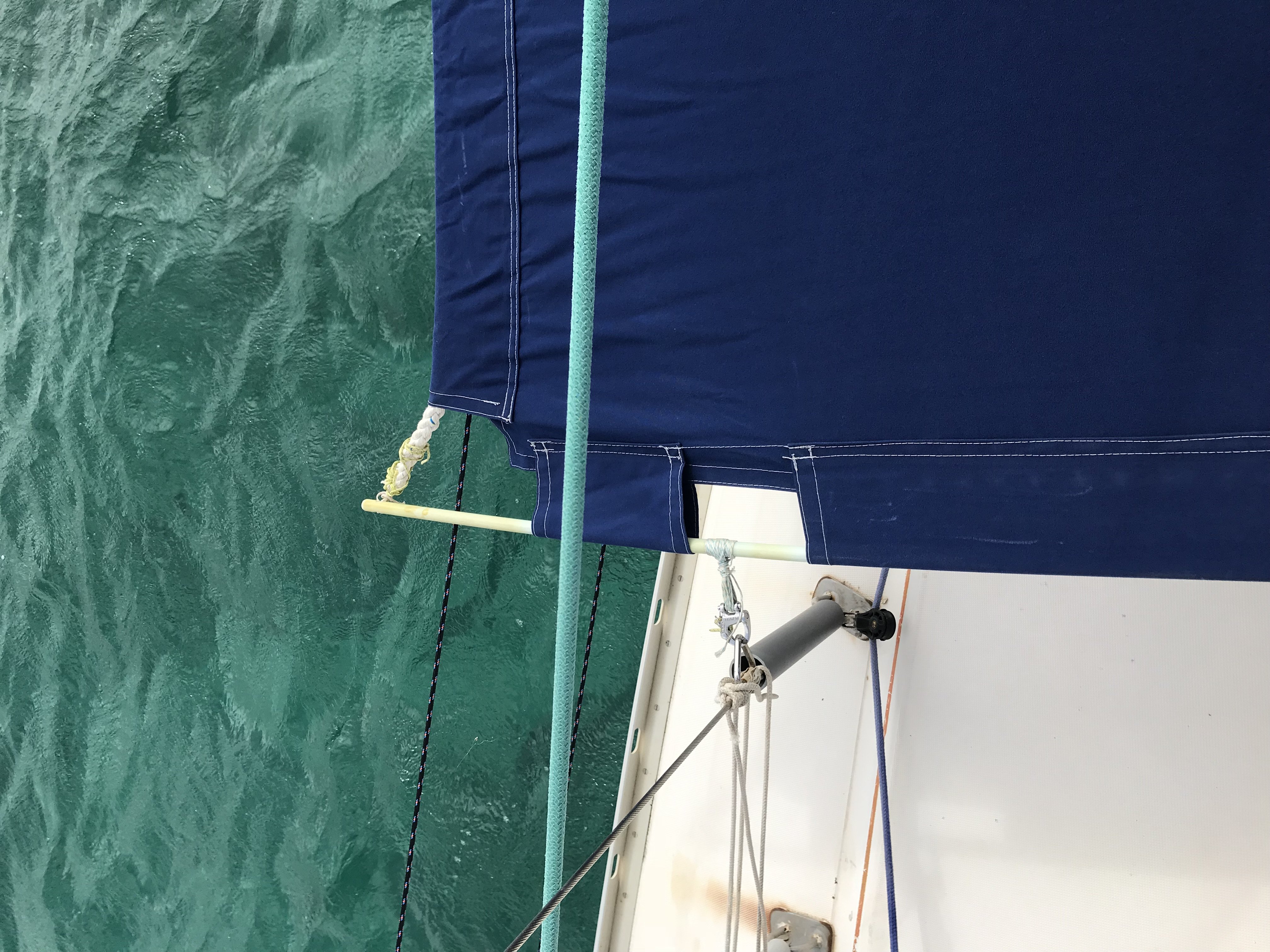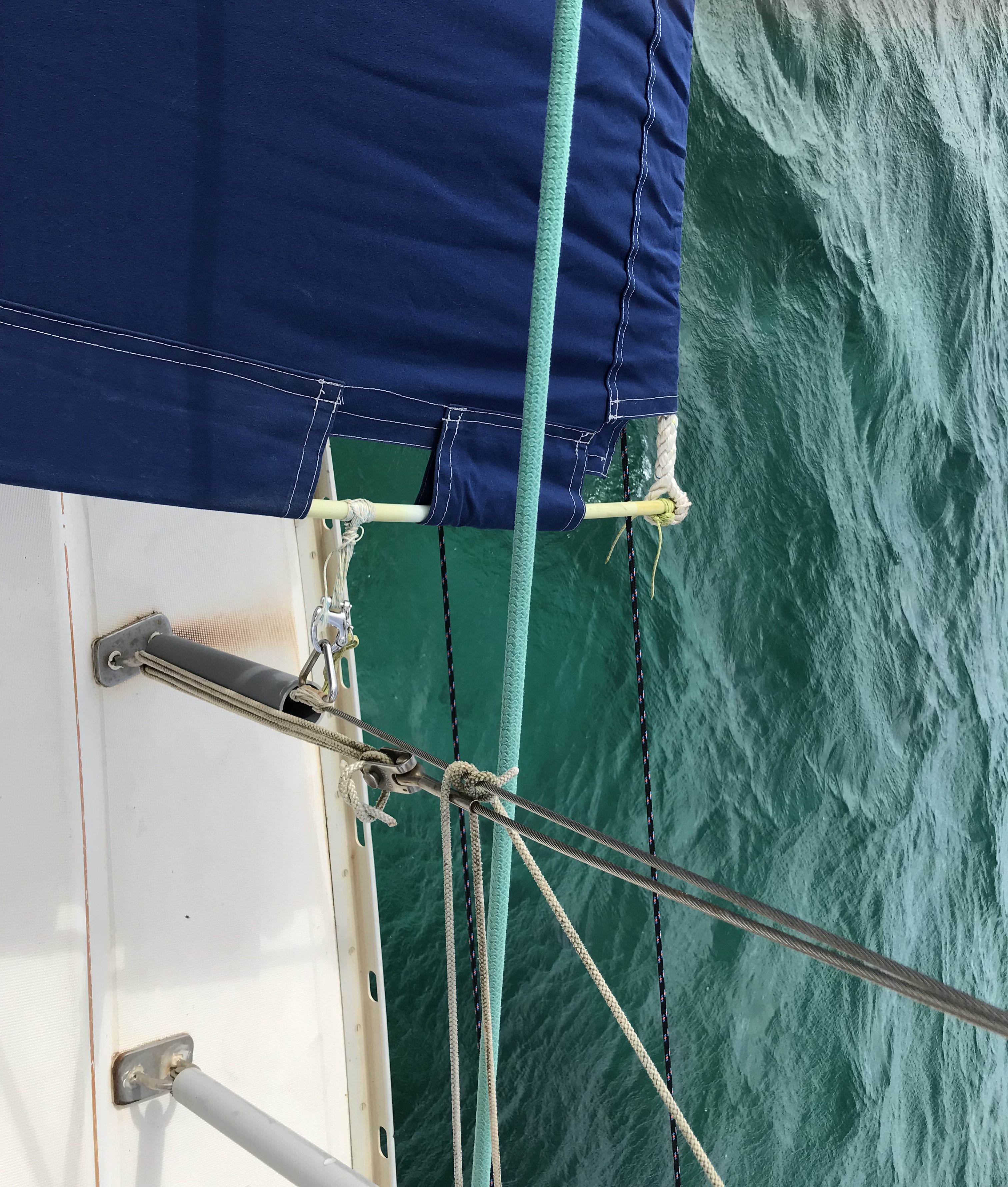 A l'arrière , deux mousquetons rapides permettent de fixer la latte arrière sur deux demi oeils inox ligaturés sur les bas haubans avant